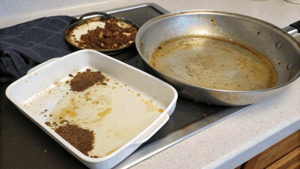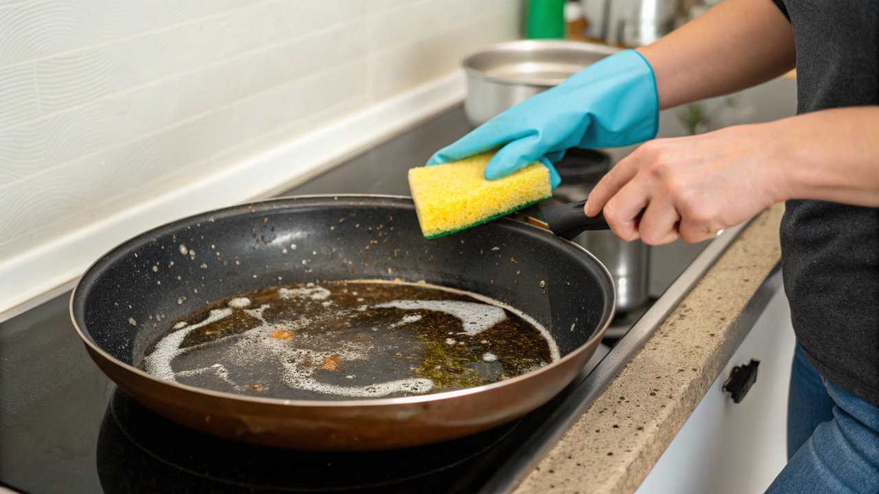 Esse processo forma uma camada difícil de remover apenas com detergente comum. Além disso, resíduos de alimentos queimados podem intensificar a aderência da gordura.