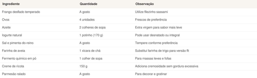 Esses ingredientes permitem uma receita balanceada, rica em proteínas e com textura macia, adequada para dietas fitness ou alimentação equilibrada.