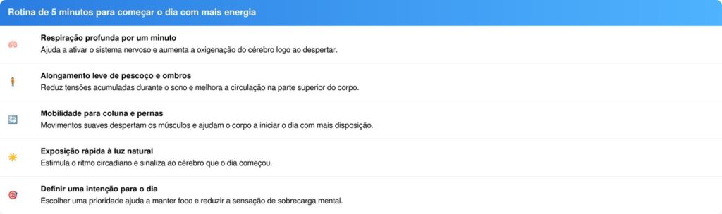 Essas práticas estimulam circulação, reduzem tensão muscular e ajudam o cérebro a iniciar o dia com mais clareza.