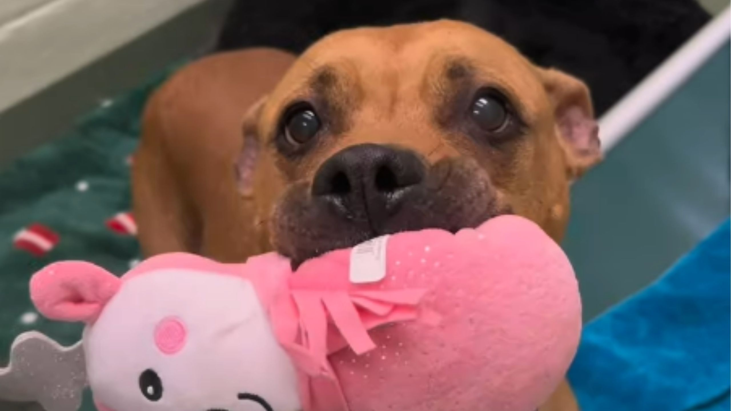 Cadelinha de abrigo 'esquecida' tenta compartilhar brinquedos com qualquer pessoa que passe por perto de sua casinha