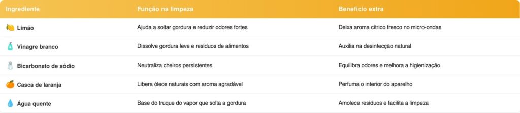 A limpeza com vapor funciona porque o calor úmido ajuda a dissolver e amolecer a gordura acumulada no interior do aparelho. Quando a água aquece dentro do micro-ondas, o vapor se espalha pelas paredes internas, soltando os resíduos.