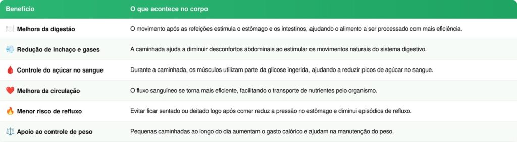 Além disso, essa prática simples pode reduzir o inchaço abdominal, equilibrar o açúcar no sangue e melhorar o metabolismo. Especialistas afirmam que até caminhadas curtas já fazem diferença quando incorporadas à rotina.