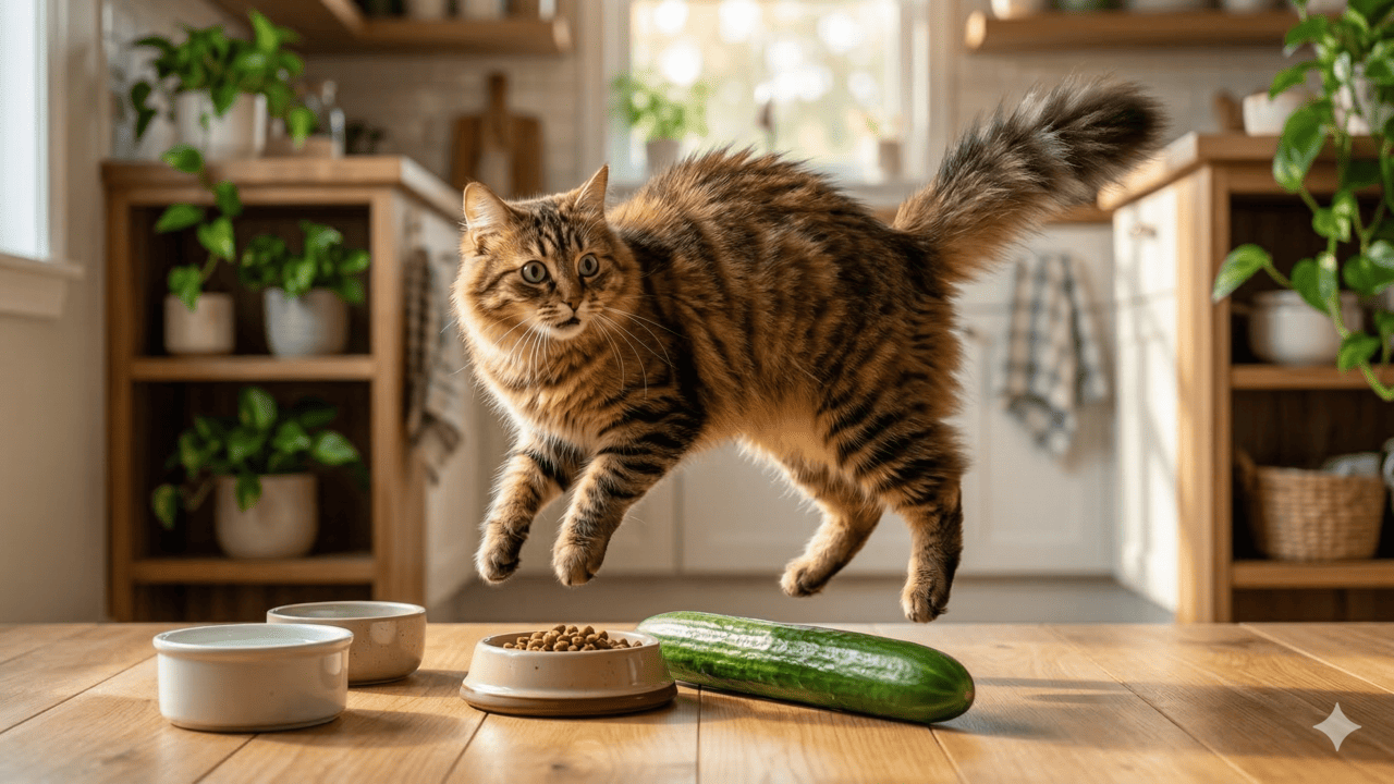 Gatos reagem a pepinos devido ao instinto de autopreservação que identifica objetos longos e silenciosos como ameaças. O estresse causado por esses sustos prejudica o bem-estar e a confiança do animal.