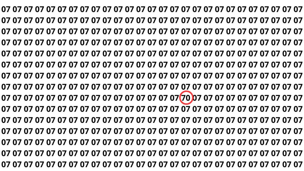 À primeira vista, o cérebro tende a agrupar tudo o que é parecido. Em um quadro lotado de “07”, a mente cria um padrão visual e ignora detalhes pequenos. O número 70, por ser muito parecido, se mistura com o resto e exige mais concentração para ser percebido.