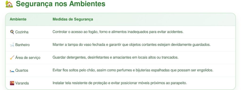 Alguns cômodos da casa exigem uma atenção extra quando o assunto é um gato curioso e cheio de energia. A cozinha, por exemplo, reúne fogão, forno, panelas quentes e alimentos que podem fazer mal, enquanto banheiro, área de serviço e varanda concentram produtos tóxicos e objetos que despertam o instinto explorador do felino.