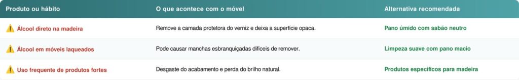 Álcool, excesso de água e produtos abrasivos estão entre os hábitos que danificam seus móveis. Veja erros comuns de limpeza doméstica e como preservar madeira, MDF e estofados.