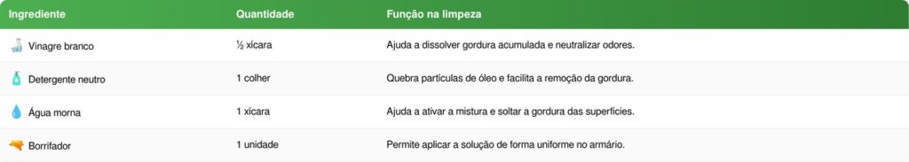 Além de prática, a solução ajuda a remover aquela camada pegajosa que costuma se acumular nos armários próximos ao fogão. Quando aplicada corretamente, ela dissolve a gordura e facilita a limpeza sem necessidade de esfregar com força.