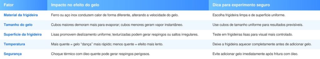 A intensidade do efeito Leidenfrost varia conforme temperatura, material da frigideira e tamanho do gelo.