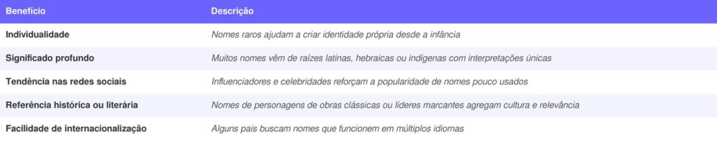 Além disso, nomes pouco comuns podem criar uma marca pessoal desde cedo, sendo lembrados com facilidade e transmitindo personalidade em qualquer ambiente, da escola às redes sociais.