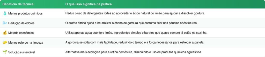 Além de prática, a técnica de água quente com limão para remover gordura grudada nas panelas apresenta alguns benefícios que explicam sua popularidade nas redes sociais e entre cozinheiros domésticos.