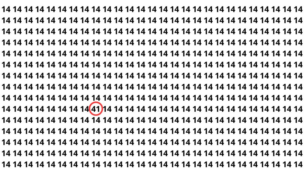 Encontrar o número 41 entre vários 14 parece fácil à primeira vista, mas complica quando o cérebro é bombardeado com estímulos repetidos quase idênticos. A repetição constante de “14” cria um padrão tão forte que qualquer detalhe fora do normal tende a ser ignorado, principalmente quando você está com pressa.