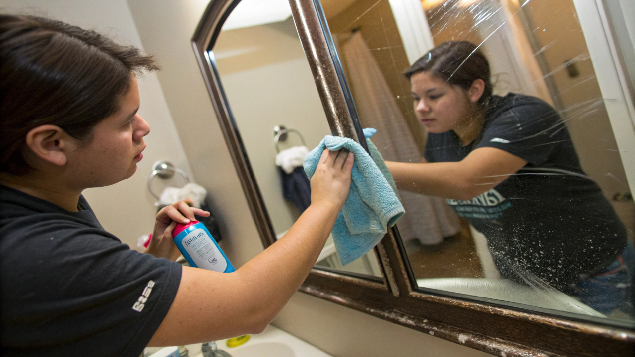 Erro ao limpar espelho, como excesso de produto e pano inadequado, causa manchas persistentes. Método correto usa microfibra, pouca solução e técnica uniforme para evitar marcas.