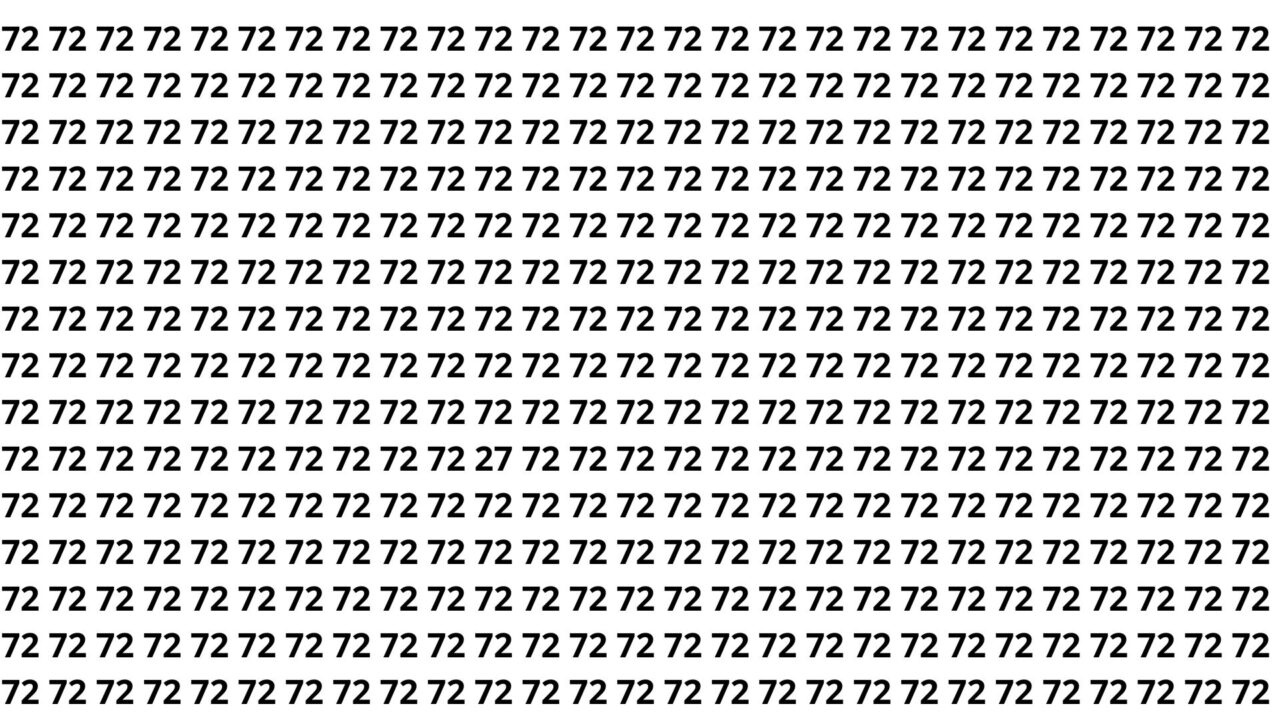 Na imagem desse tipo de puzzle, a resposta é justamente o número 27, perdido em meio a uma sequência longa de 72. Ele geralmente aparece em uma linha intermediária ou perto da borda, exatamente nos lugares onde o olhar costuma passar rápido demais.
