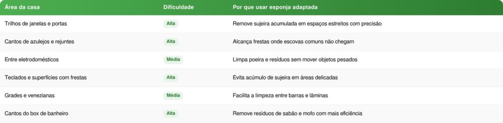 Esses pontos costumam acumular sujeira difícil de remover com métodos convencionais. Por isso, a esponja adaptada se torna uma aliada importante na limpeza detalhada.