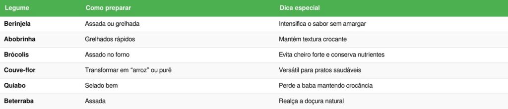 Muitos legumes são rejeitados por causa de amargor, textura ou preparo inadequado. Brócolis cozido demais, por exemplo, perde sabor e ganha cheiro forte. Já a berinjela pode ficar encharcada se não for tratada corretamente.