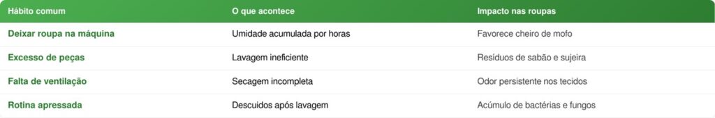 Deixar roupas úmidas por muito tempo é o principal erro que causa cheiro de mofo. Falta de ventilação, secagem incompleta e excesso na máquina favorecem fungos e odores persistentes.