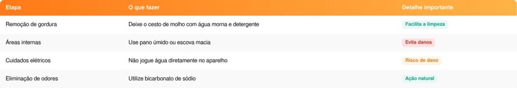 Além disso, resíduos queimados podem gerar fumaça durante o uso. Por outro lado, manter a airfryer limpa garante preparo mais saudável e eficiente, especialmente para quem utiliza o aparelho diariamente.