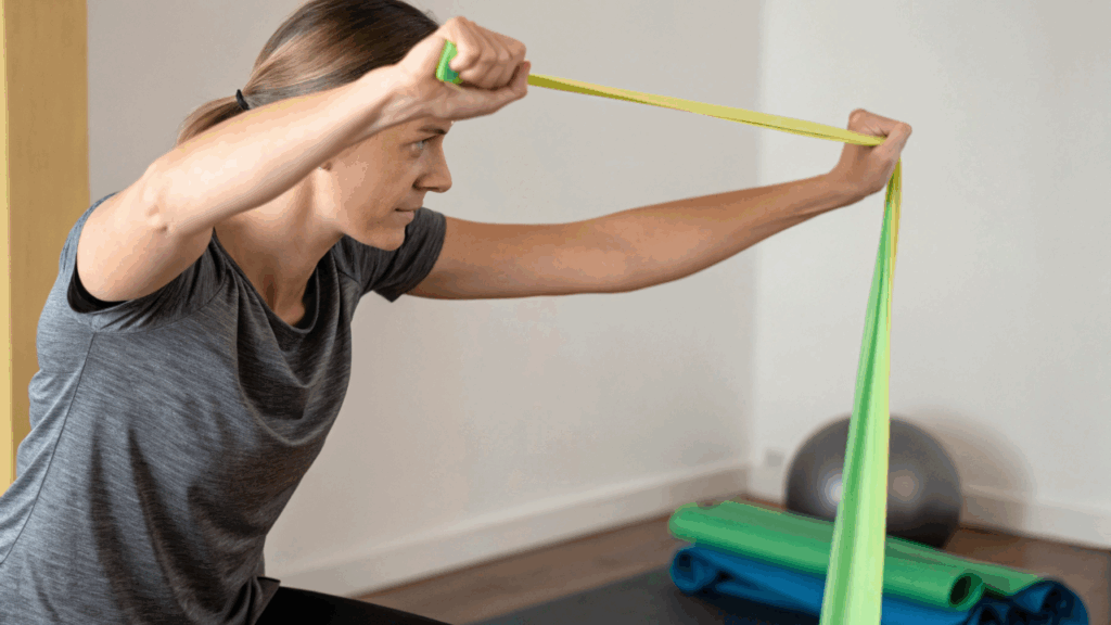 • Remada baixa com elástico – ativa trapézio e romboides, melhorando postura.