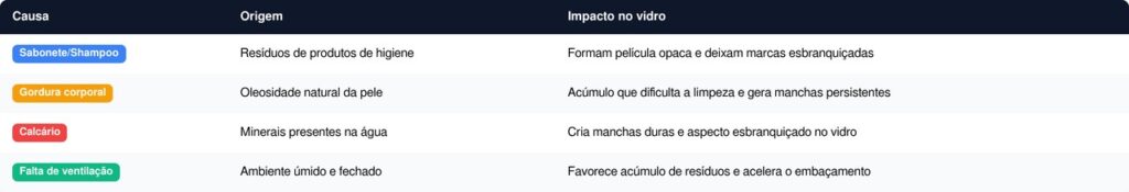 Antes de entender como deixar o box do banheiro transparente, é importante saber o motivo do problema. O embaçamento e as manchas surgem principalmente pelo acúmulo de: