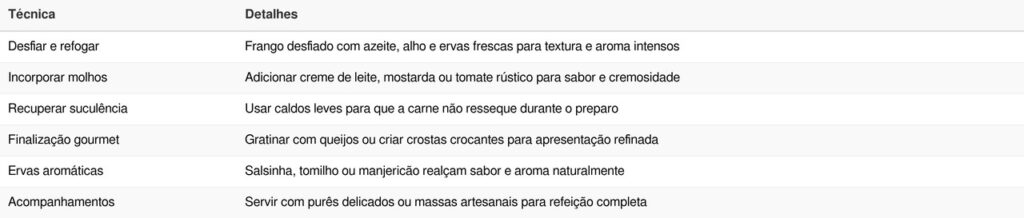 Algumas preparações são especialmente eficientes para transformar sobras de frango em pratos mais elaborados. A seguir, opções que combinam praticidade e apresentação refinada: