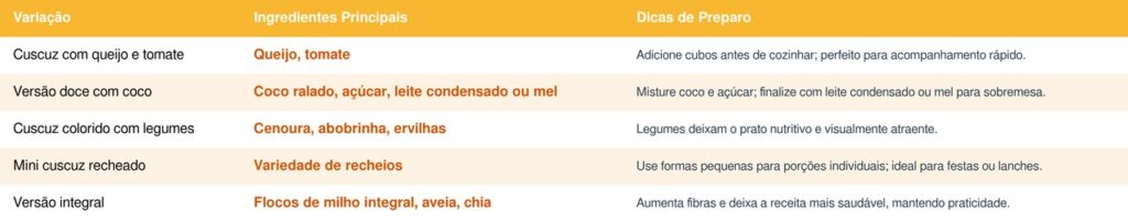 Essas variações demonstram a versatilidade do cuscuz no micro-ondas, adaptando-se ao gosto pessoal e à rotina, sem perder tempo na cozinha. Além disso, permitem explorar combinações que agradam crianças e adultos, tornando o prato mais atrativo.