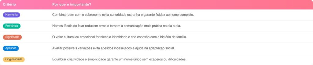 Além disso, vale observar como o nome será percebido em diferentes fases da vida. Um nome infantil precisa também funcionar na vida adulta, especialmente em contextos profissionais.