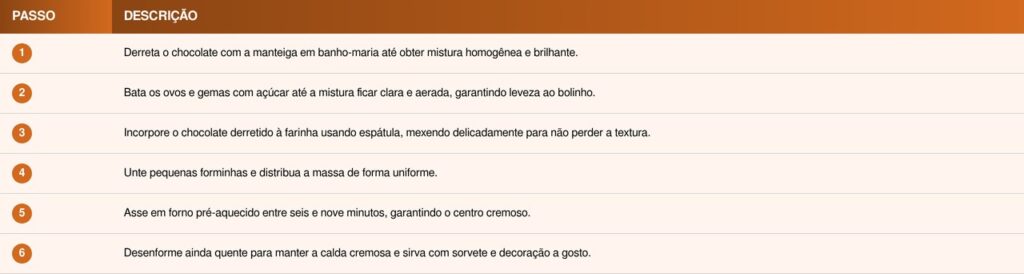 Esses passos garantem um bolinho com interior líquido e aparência de confeitaria profissional, mesmo para iniciantes.