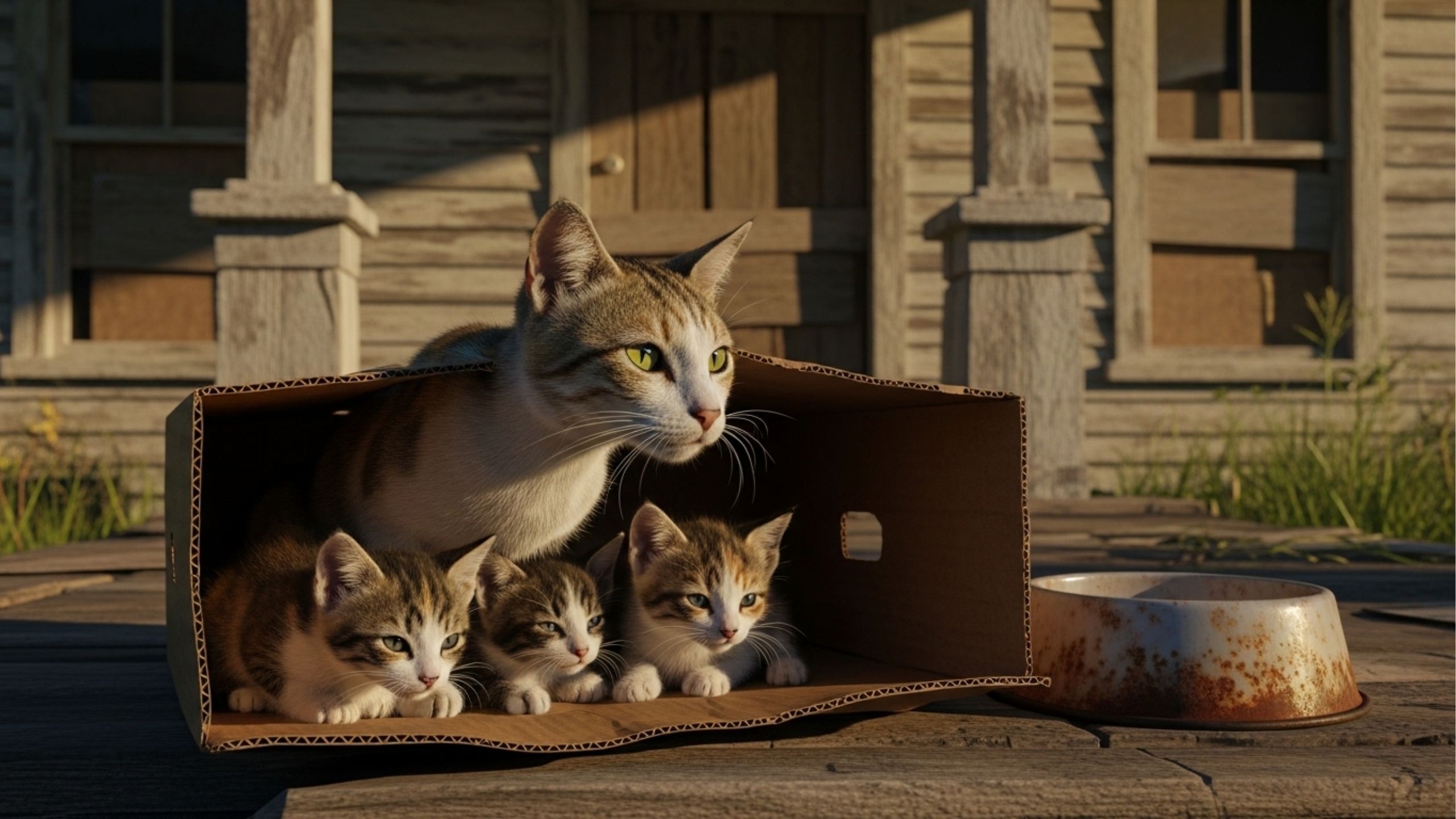 O episódio aconteceu em uma área residencial tranquila, onde a gata havia encontrado um espaço improvisado para cuidar de seus filhotes. Ainda muito pequenos, os gatinhos permaneciam próximos da mãe, buscando proteção, calor e segurança enquanto observavam atentamente tudo ao redor.