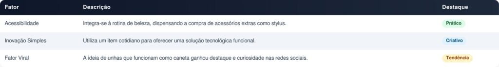 O esmalte que transforma unhas em caneta touch mostra que o futuro da tecnologia pode estar em soluções simples, acessíveis e integradas ao cotidiano. Mais do que um produto curioso, ele representa uma mudança de mentalidade. Em vez de criar dispositivos complexos, a inovação pode surgir a partir de objetos comuns.