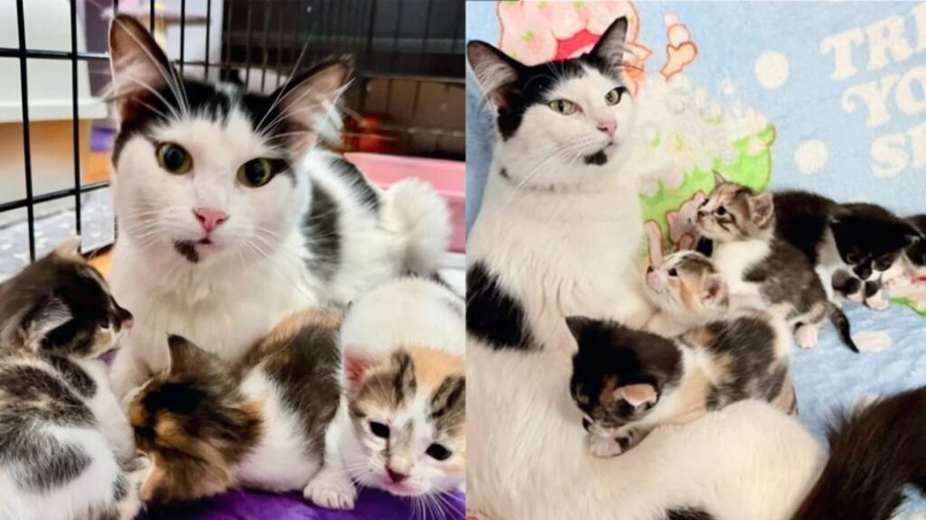 Ao se aproximar, a mulher descobriu a origem dos miados. Dentro da residência, uma gata havia dado à luz e tentava cuidar sozinha de seus filhotes. Sem acesso adequado a comida, água ou proteção, a situação era delicada. Mesmo assim, a mãe permanecia firme, guiada por seu instinto materno e protegendo os pequenos como podia.