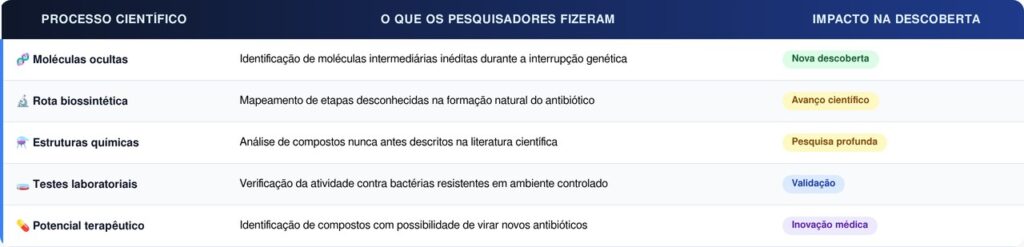 A descoberta científica ocorreu a partir da manipulação genética de bactérias do solo. Ao desativar genes específicos, os cientistas conseguiram interromper a produção de compostos conhecidos em etapas estratégicas.