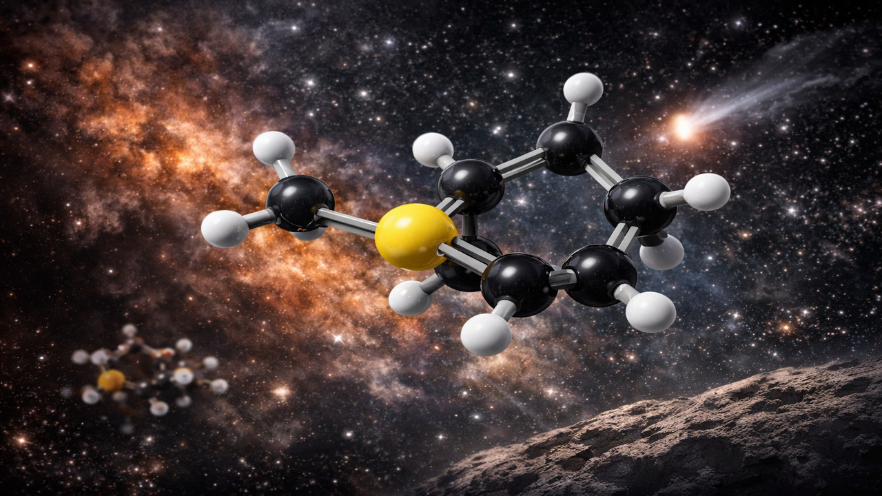 A molécula identificada, chamada 2,5-cicloexadieno-1-tiona, contém carbono, hidrogênio e enxofre — três elementos fundamentais para a bioquímica terrestre. O diferencial está no tamanho: ela possui treze átomos, sendo a maior molécula com enxofre já detectada no espaço interestelar.
