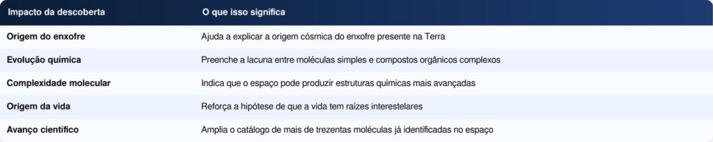 A identificação da molécula com enxofre no espaço fortalece a hipótese de que os blocos fundamentais da vida não surgiram exclusivamente na Terra, mas podem ter sido “importados” do espaço.