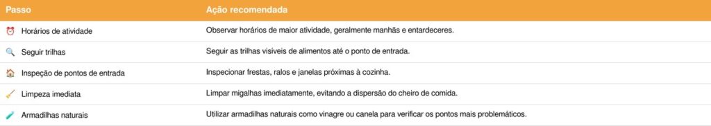 Siga as trilhas visíveis de alimentos até frestas, ralos, janelas ou espaços entre armários. Observar horários de maior atividade ajuda a localizar o foco.