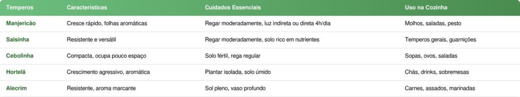 Alguns temperos se adaptam com facilidade a vasos e ambientes internos, exigindo luz indireta ou sol parcial. Entre os mais indicados estão: