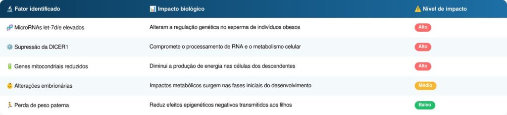A obesidade paterna afeta o metabolismo dos filhos ao provocar alterações epigenéticas no esperma, segundo um estudo recente baseado em modelos experimentais. A pesquisa investiga como mudanças moleculares no pai podem impactar diretamente a saúde metabólica da prole.