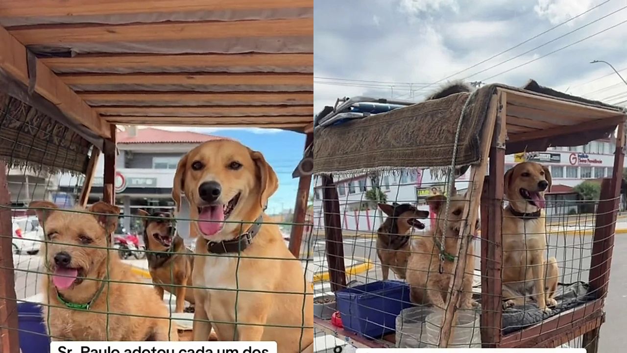 O carrinho improvisado, feito com madeira, tela e um pequeno toldo, funciona como um “transporte coletivo” canino, garantindo conforto e segurança durante o trabalho. Ali, os animais têm sombra, água e, principalmente, a presença constante do tutor, o que ajuda na recuperação emocional depois de tantas experiências difíceis.