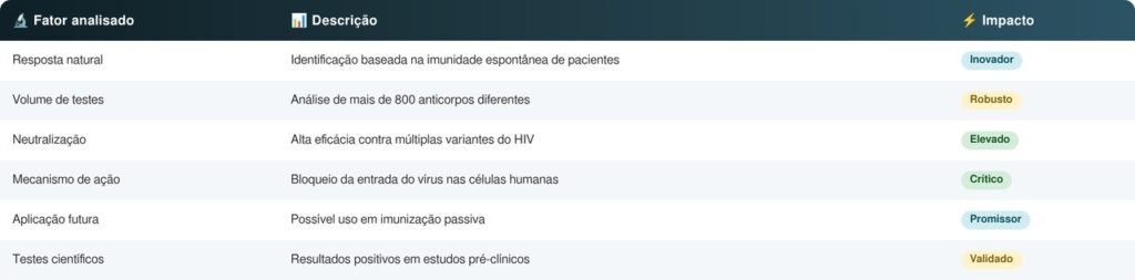 Esse anticorpo demonstrou uma capacidade superior de neutralização do vírus. Em testes laboratoriais, ele bloqueou o ponto exato onde o HIV se liga às células humanas, impedindo que o vírus se multiplique — um dos principais desafios no combate à doença.
