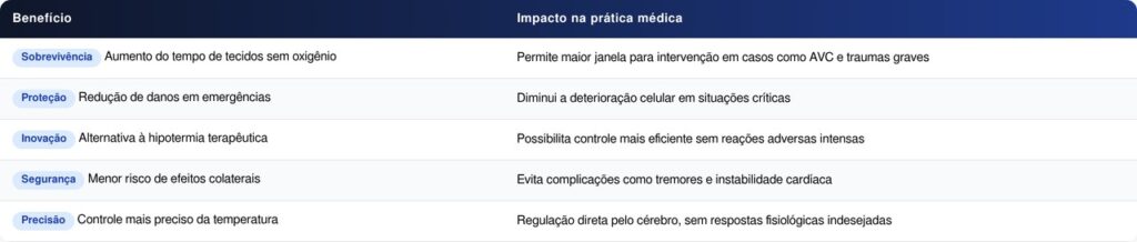 Atualmente, a hipotermia terapêutica já é utilizada, mas com limitações importantes, como tremores e instabilidade cardíaca. A nova abordagem pode contornar esses problemas ao agir diretamente no cérebro.