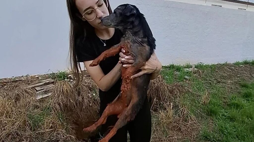 Seguindo o trajeto indicado pelo animal, a protetora chegou até uma vala escondida no terreno. Lá, quase invisível, estava a cadela — debilitada, com sinais de sarna e sem forças para sair sozinha.