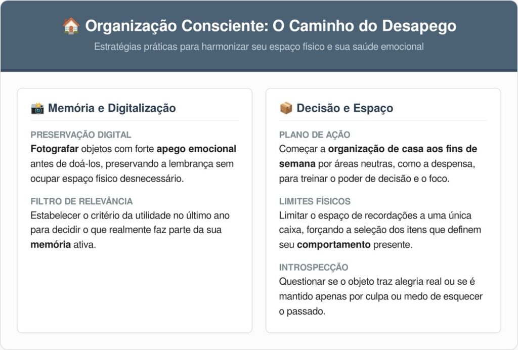 Ao priorizar a organização de casa aos fins de semana, o indivíduo sinaliza para si mesmo que o espaço para o novo é mais valioso do que a estagnação do antigo. Romper com esse padrão de comportamento exige uma abordagem gentil, onde se reconhece o valor da memória sem permitir que ela dite as regras da funcionalidade do ambiente atual, conforme as práticas abaixo: