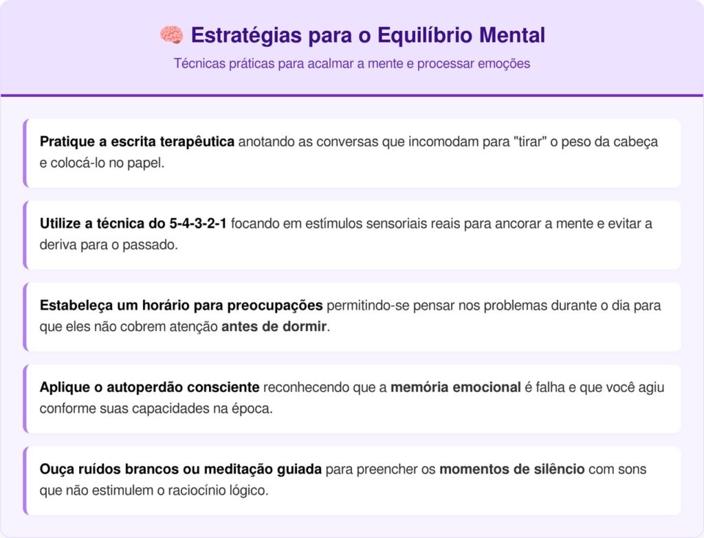 Ao adotar esses hábitos, o indivíduo retoma o comando sobre seus pensamentos e enfraquece a compulsão por correções retroativas. Essa mudança de postura é essencial para quem busca uma comunicação interna mais gentil e menos pautada pela autocrítica destrutiva nos períodos de repouso.