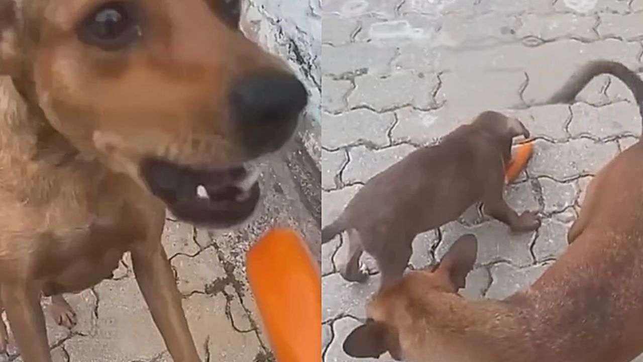 Em uma rua movimentada de Guarulhos, na Grande São Paulo, uma cena simples emocionou quem passava: uma cadela em situação de rua recebeu uma salsicha de uma moradora e, em vez de comer na mesma hora, virou-se para o filhote que a acompanhava e ofereceu o alimento a ele primeiro. Só depois, quando ganhou outra porção, começou a se alimentar. O gesto, registrado em vídeo, logo se espalhou pelas redes sociais e reacendeu a discussão sobre como o instinto materno aparece nos animais, especialmente em cães e gatos que vivem nas ruas.