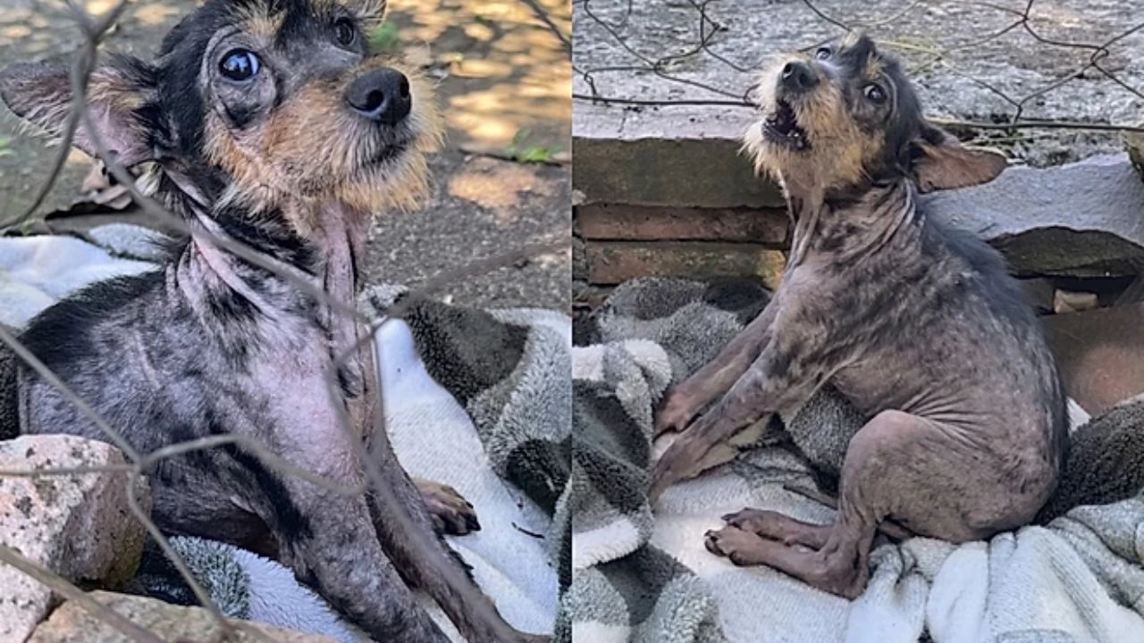 Azeitona foi encontrado arisco, doente de sarna e claramente assustado, reagindo com desespero a qualquer tentativa de aproximação. Esse comportamento é muito comum em cães que sofreram maus-tratos ou passaram longos períodos na rua, sem carinho, rotina ou qualquer tipo de segurança.