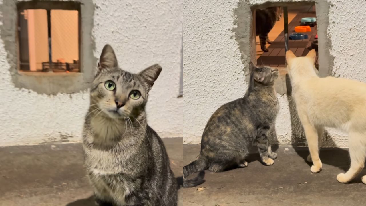 Um pequeno acesso no muro permite que eles entrem e saiam quando quiserem, mantendo certa liberdade sem deixar de contar com um ponto seguro de apoio. Esse tipo de passagem controlada também reduz o risco de atropelamentos em comparação com saídas diretas para a rua.