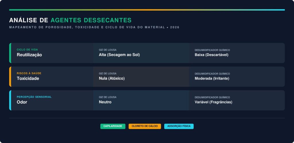 O giz é composto majoritariamente por gesso, um material altamente poroso que possui propriedades higroscópicas naturais. Essa estrutura física permite que o objeto atraia e retenha as moléculas de água suspensas no ar do guarda-roupa.