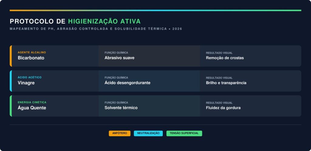 Preparar uma solução caseira eficaz exige a combinação de agentes que consigam quebrar as moléculas de lipídios acumuladas. O uso de componentes alcalinos é fundamental para amolecer as crostas sem causar riscos ou danos na superfície vítrea do eletrodoméstico.