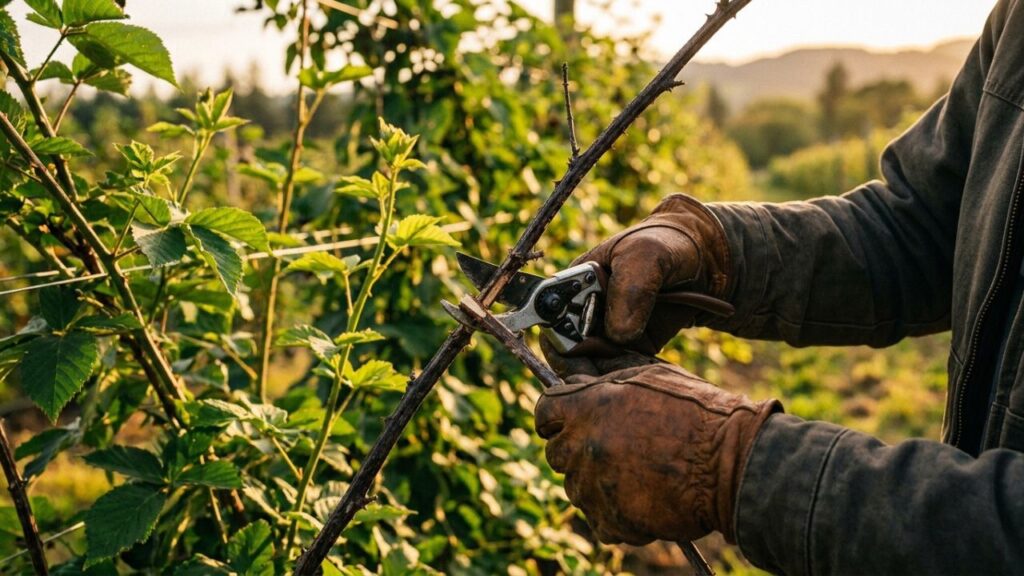 A amora-preta frutifica em ramos de segundo ano que perdem o vigor produtivo logo após a primeira colheita. Manter essas hastes velhas no arbusto consome a energia da planta sem gerar resultados práticos na safra seguinte.
