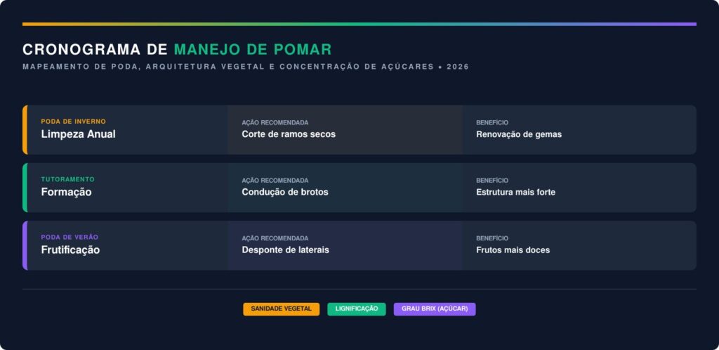O período ideal para a intervenção ocorre logo após o término da colheita ou durante a fase de dormência vegetal. Esse tempo de repouso permite que os tecidos cicatrizem sem o risco de atrair insetos prejudiciais à saúde do pomar.