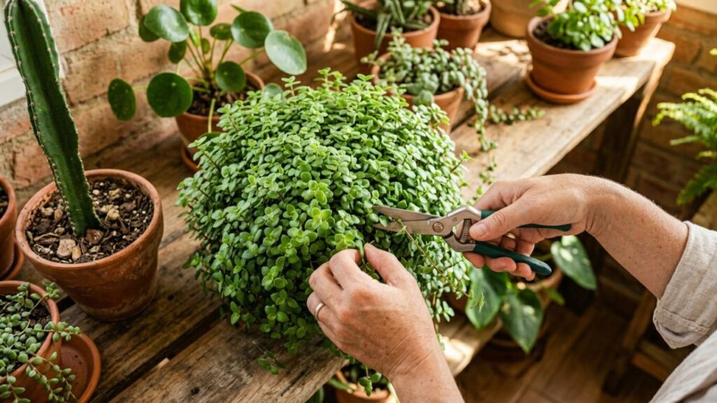 Retirar os ramos secos ou excessivamente longos ajuda a planta a concentrar nutrientes nas partes mais jovens e saudáveis. A poda de manutenção estimula o surgimento de novos brotos, mantendo o aspecto cheio e arredondado do vaso.